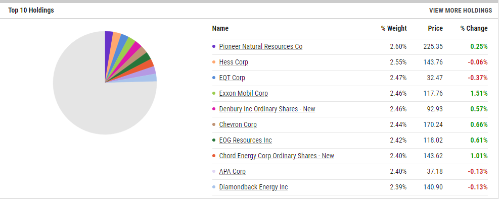 In other words, it starts with the same-sized stake in each of its holdings… Like with any portfolio, the stronger the stock, the more of it you end up owning (until the next rebalancing). As of today, the ETF owns a larger position in PXD than it does in ExxonMobil (XOM) or Chevron (CVX), as you can see below.