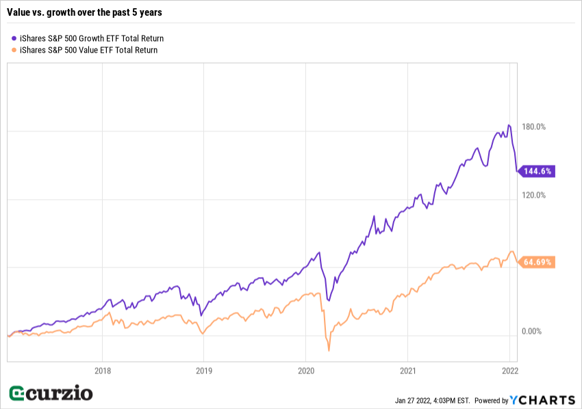 As you can see from the chart below, value has a long way to go until it catches up with growth: Over the past five years, growth outperformed by some 80%.