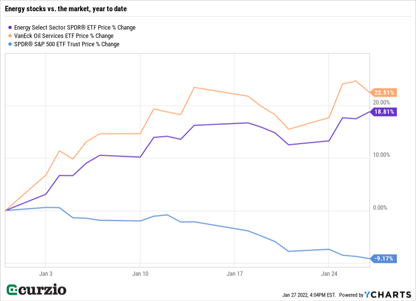 Represented on the chart below by two related exchange-traded funds (ETFs)—the Energy Select Sector SPDR (XLE) and the VanEck Oil Services (OIH)—energy stocks rallied double digits in the first few weeks of the year… vs. the market’s nearly 10% loss.