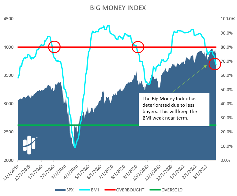 Since then, markets have bobbed and weaved. But my trusty Big Money Index (BMI) is flashing a caution sign. It’s been on a one-way train lower since the end of February.
