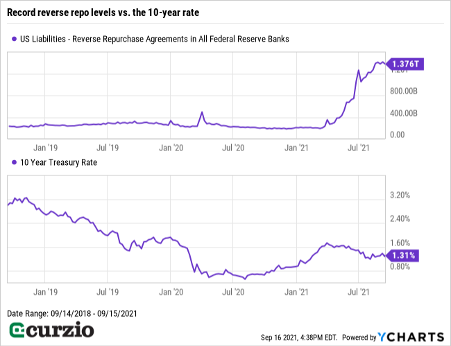 And this spring, the Fed lowered the amount needed to “invest” with it… and hiked interest rates on RRP to 0.05% (from zero). That caused more and more money to flow into the RRP… from about $200 billion in March to more than $1.4 billion in September.