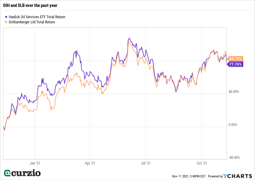 Schlumberger (SLB) dominates the industry… and accounts for more than 20% of the OIH (it’s the largest holding in the ETF). This is why the returns on both over the past year look so similar.