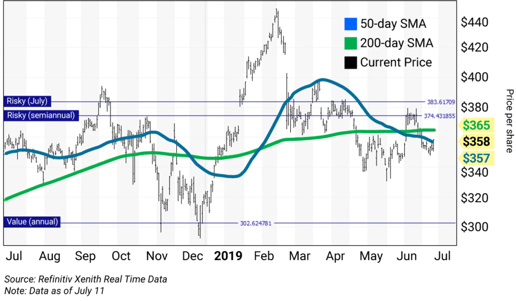 The June 28 close of $364 was an important input into my analytics system. It gave semiannual and monthly risky levels of $374 and $383, respectively. And these levels are where investors should reduce holdings. (The quarterly risky level is above the chart at $473 and will likely not come into play.)