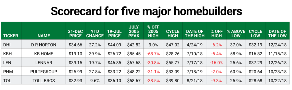 The major homebuilder stocks to focus on are D.R. Horton Inc (DHI), KB Home (KBH), Lennar Corp (LEN), PulteGroup (PHM), and Toll Brothers Inc (TOL). They’ve outperformed the stock market in a shaky housing market, and some are nearing risky levels. Here’s the performance breakdown… and levels at which to buy and reduce holdings.