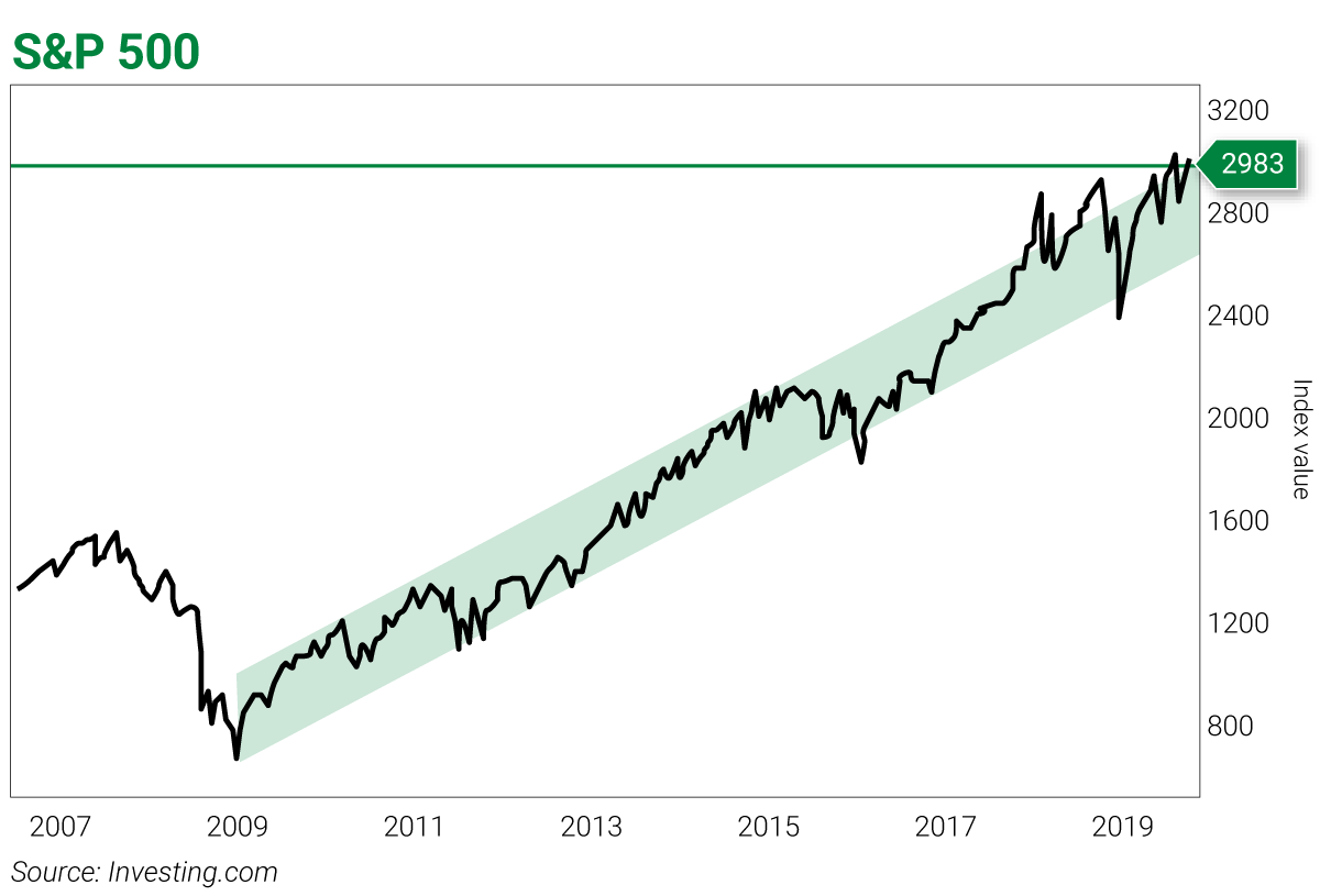 The chart below shows how the Fed’s low-rate regime since 2009 has largely tamed S&P 500 volatility. The stock index is rising steadily… staying in a well-defined channel most of the time.