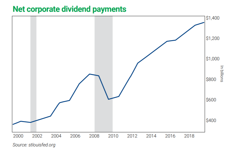 From 1999 to 2019, the only period these dividends weren’t rising was during the Great Recession. As soon as the recession was over, dividends recovered—and then some. From $622 billion in 2009, they more than doubled by 2019.