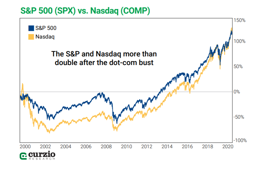 The Nasdaq bore the brunt of the dot-com selloff. And while the S&P 500 took a heavy hit too, it recovered its losses faster. By early 2013, the S&P had left it all behind… more than two years earlier than the Nasdaq.