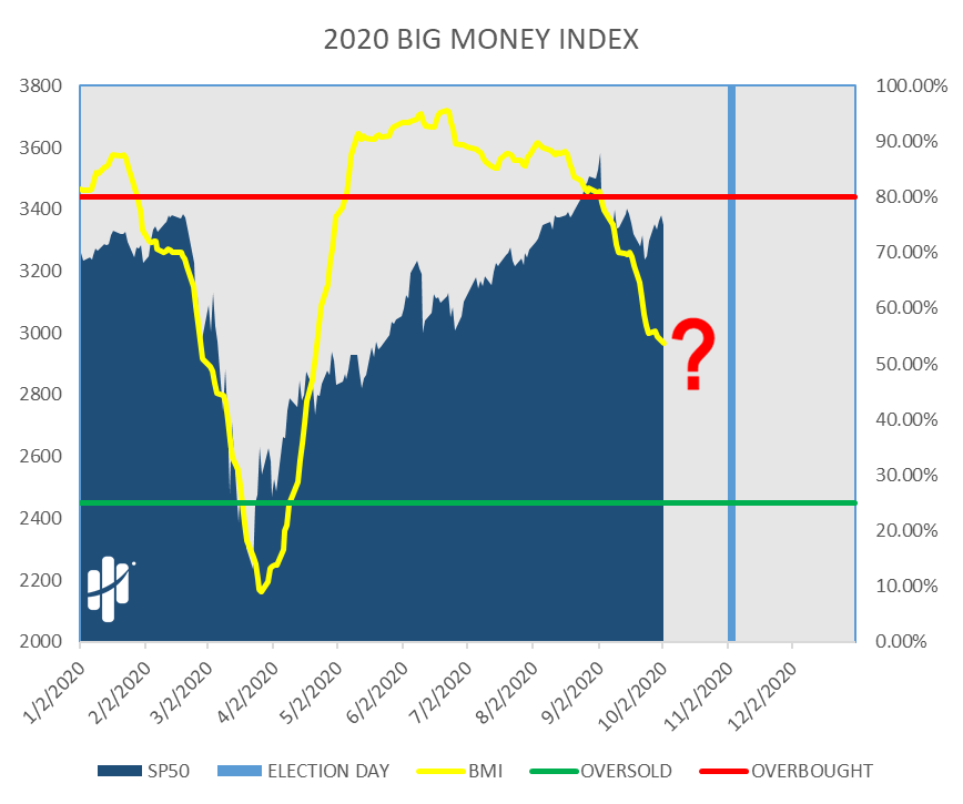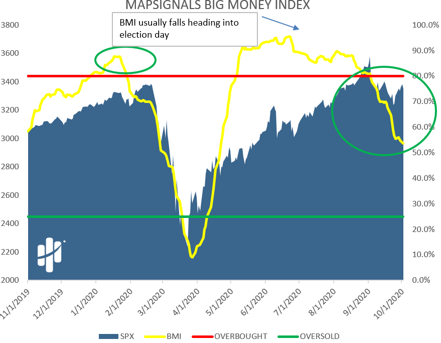 Will that happen again this year? There’s no way to know until we get there… But the theme of selling ahead of the election is already in motion. Let’s look at the BMI today under the Election Day framework: