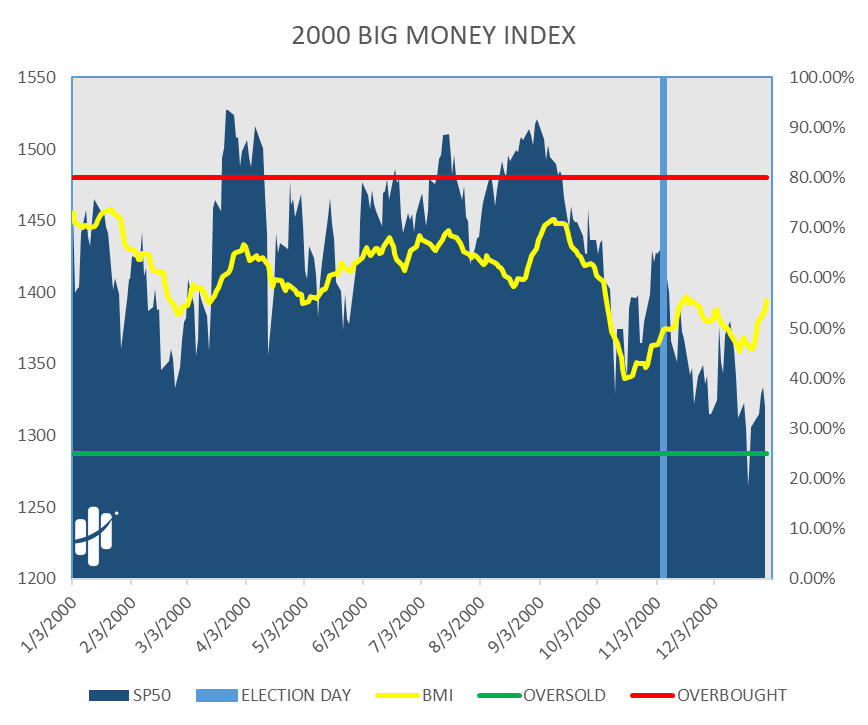 That’s what tends to happen leading up to Election Day. Two weeks ago, I showed you three historical election charts (2016, 2012, and 2008). The charts showed a pattern of Big Money selling ahead of Election Day… and buying shortly afterward.
