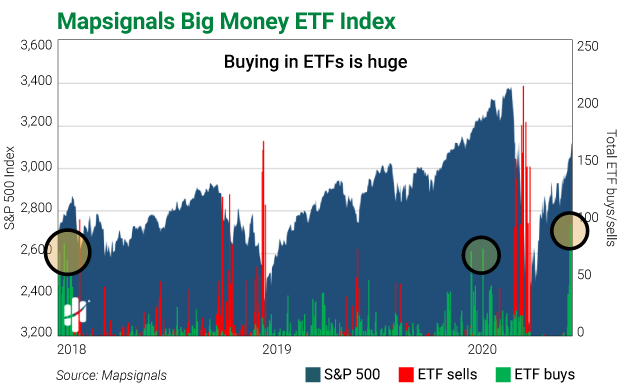 Below is the Mapsignals Big Money ETF Index vs. the S&P 500, going back to January 2018. It measures big unusual ETF buying/selling activity. The green bars represent the total number of ETFs being bought each day, and the red bars are ETFs being sold. All of this is our best guess on retail investor positioning, based on current data.