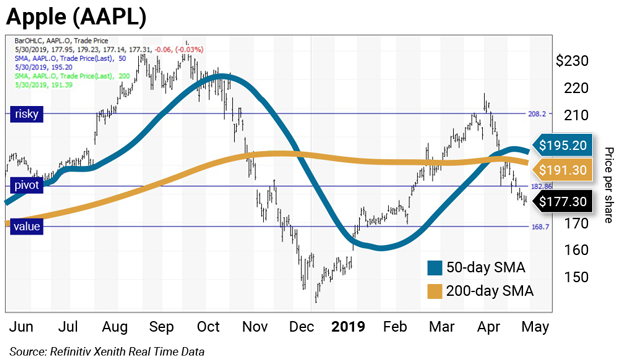 On May 23, a second warning occurred when the stock gapped below its annual pivot at $182.85. The chart suggests downside risk to its semiannual value level at $168.72, which is the level at which to buy Apple on share price weakness.