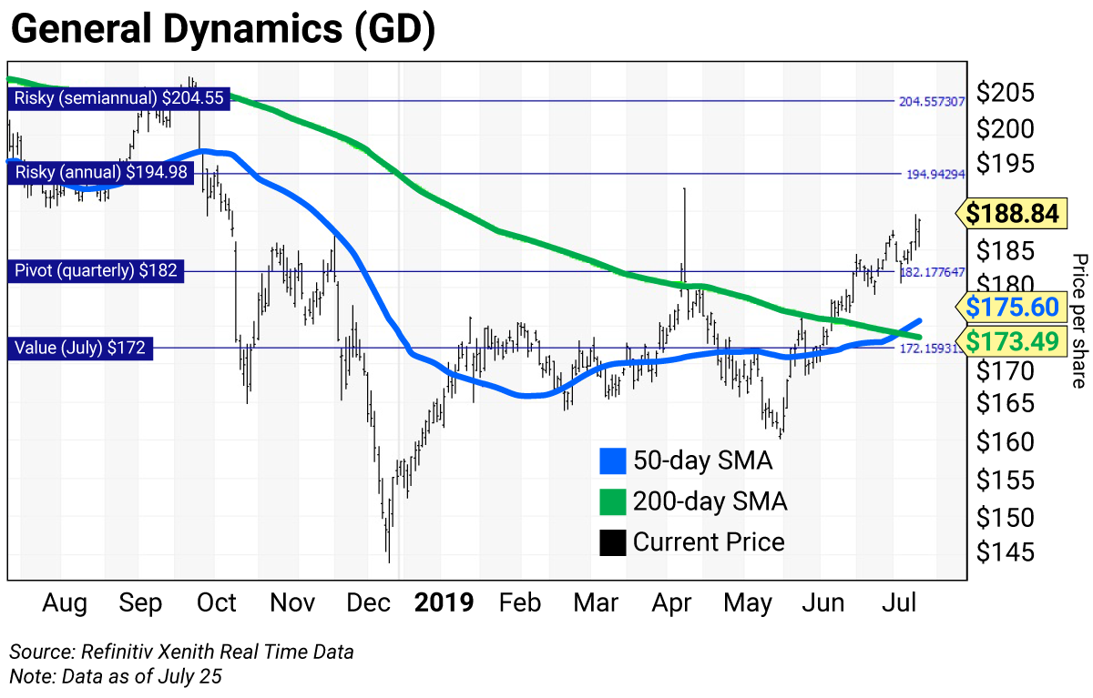 The daily chart for GD shows the stock confirmed a “golden cross” on July 19, when its 50-day simple moving average (SMA) rose above its 200-day SMA. This indicates that higher prices lie ahead.