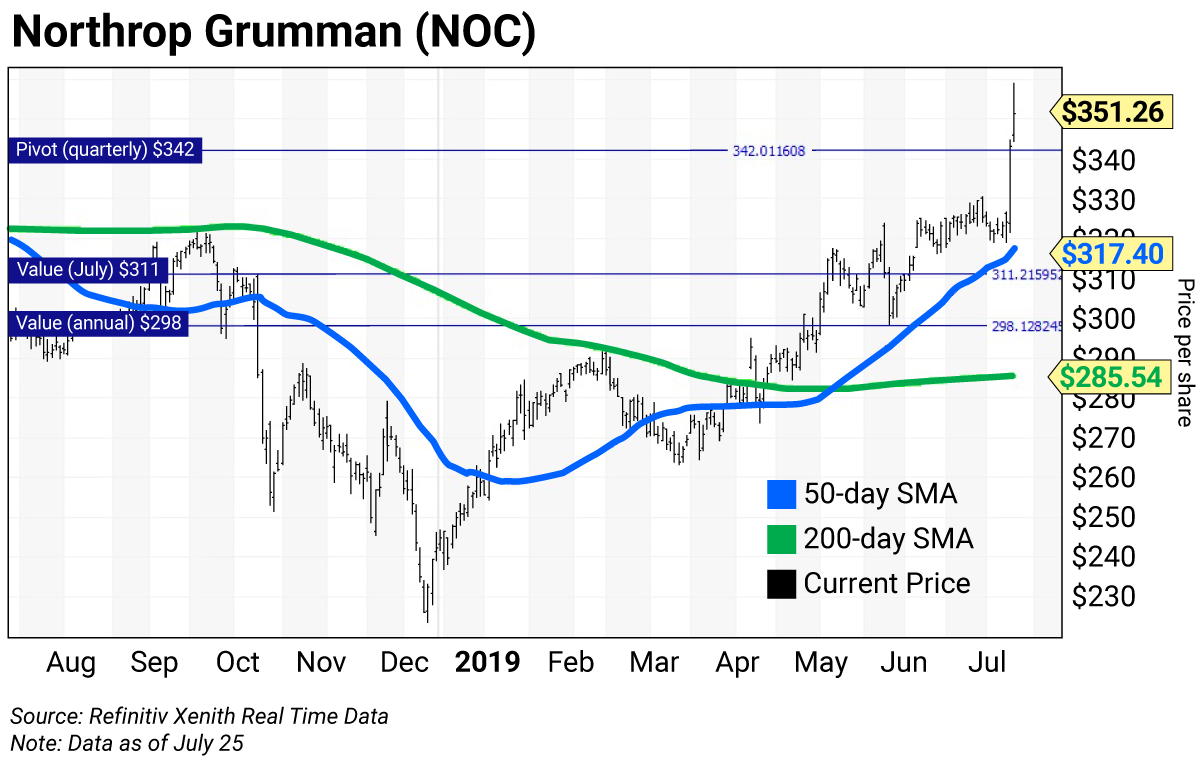 The daily chart for NOC shows the stock has been above a “golden cross” since May 22, when its 50-day SMA rose above its 200-day SMA.
