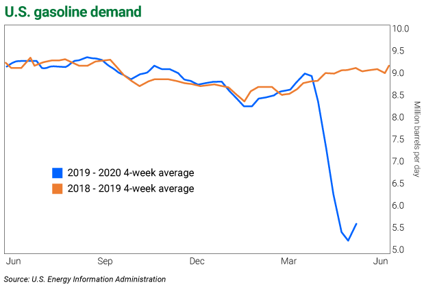 According to U.S. Energy Information Administration (EIA) data, demand for all kinds of fuels is down sharply this year. For instance, gasoline demand in the U.S. is down by more than 40% and, despite a small rebound, still sits near its all-time lows.