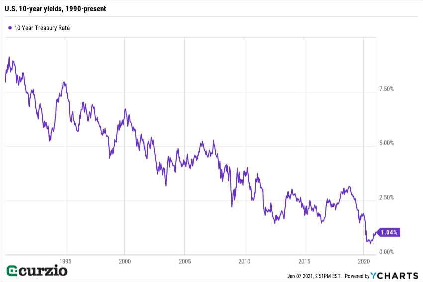 While yields are off their worst levels of 2020, they’re still stuck around 1% for the benchmark 10-Year Treasury. This means investors are lending money to the U.S. government for 10 years at just 1% per year. We’ve never before seen money this cheap.