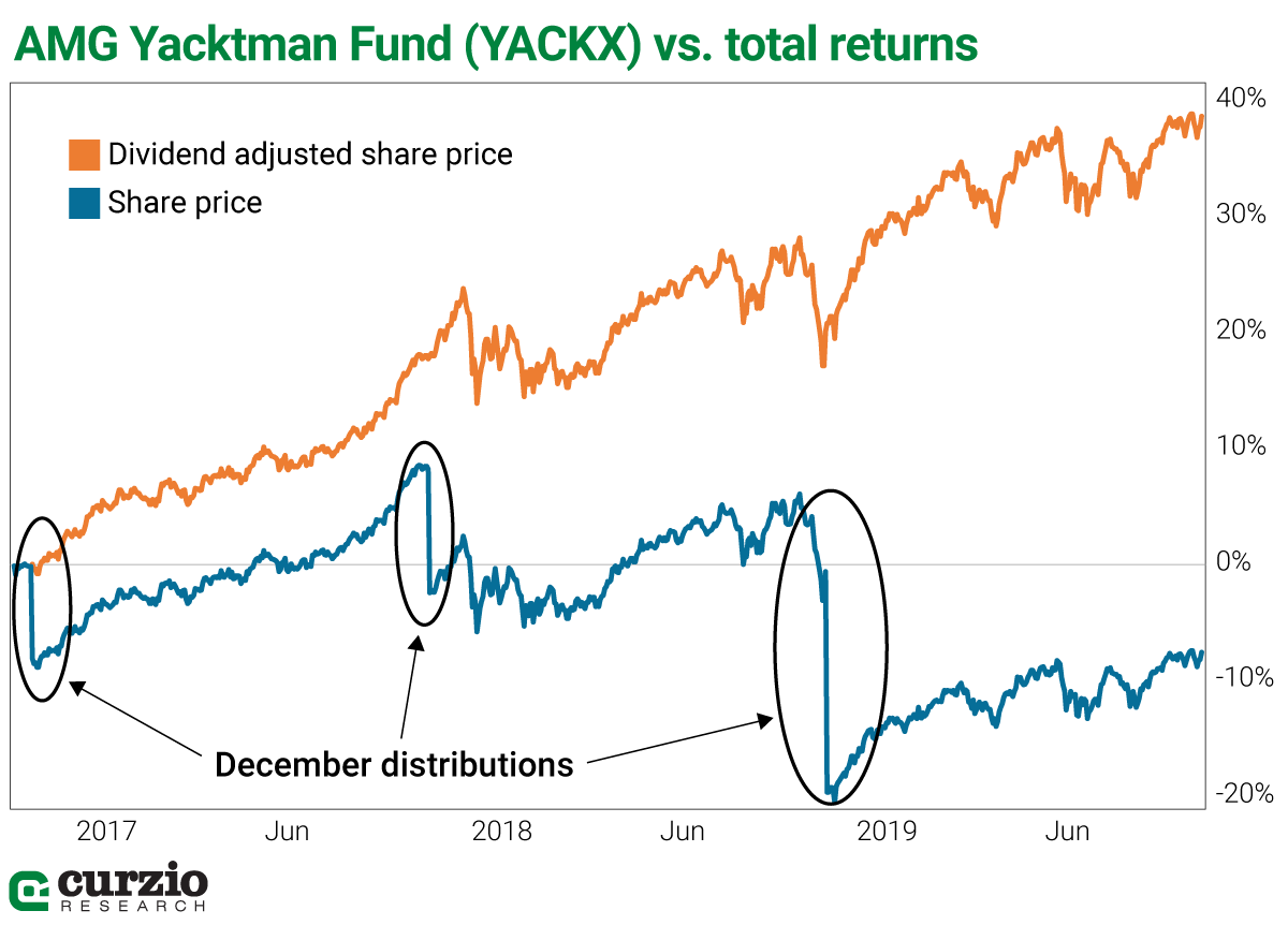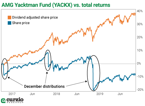 As you can see on the chart above, when a mutual fund like AMG Yacktman distributes a gain, its share price declines. But unlike a falling stock price, it doesn’t mean investors have lost money.