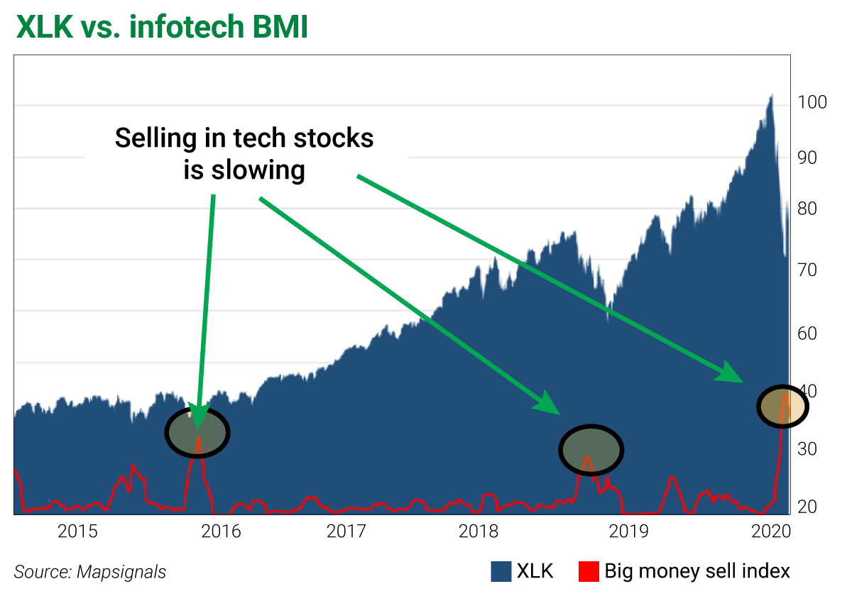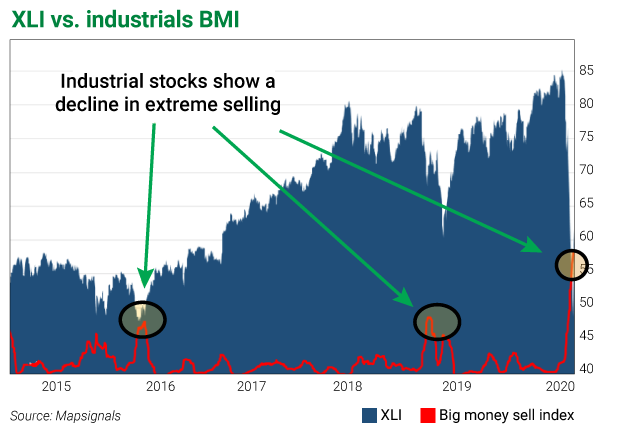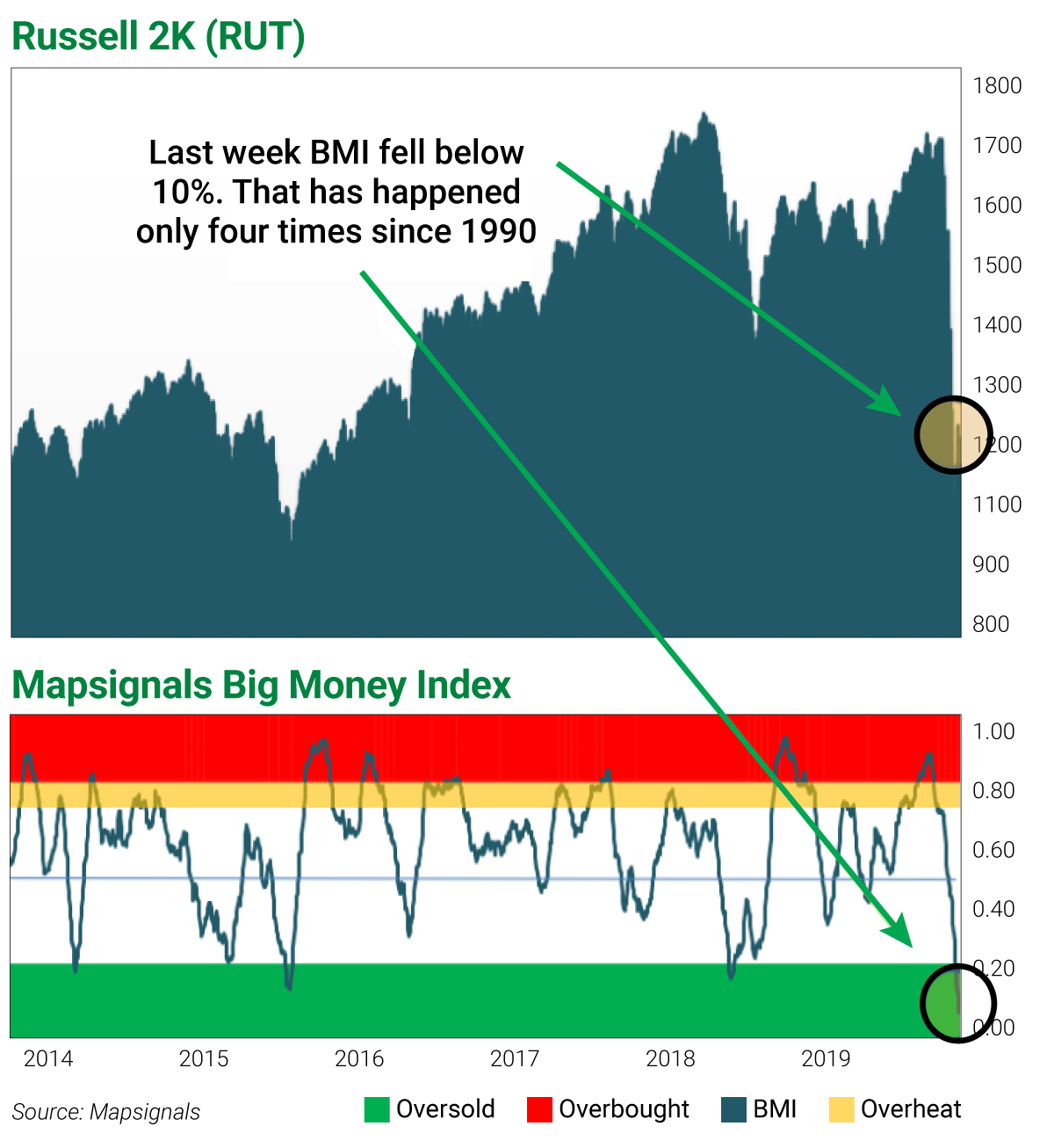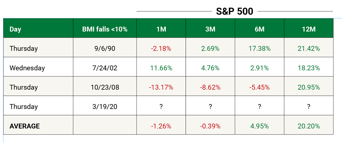 The BMI is a proprietary index that tracks money moving in and out of thousands of stocks each day. Right now, it shows that the market is extremely oversold.