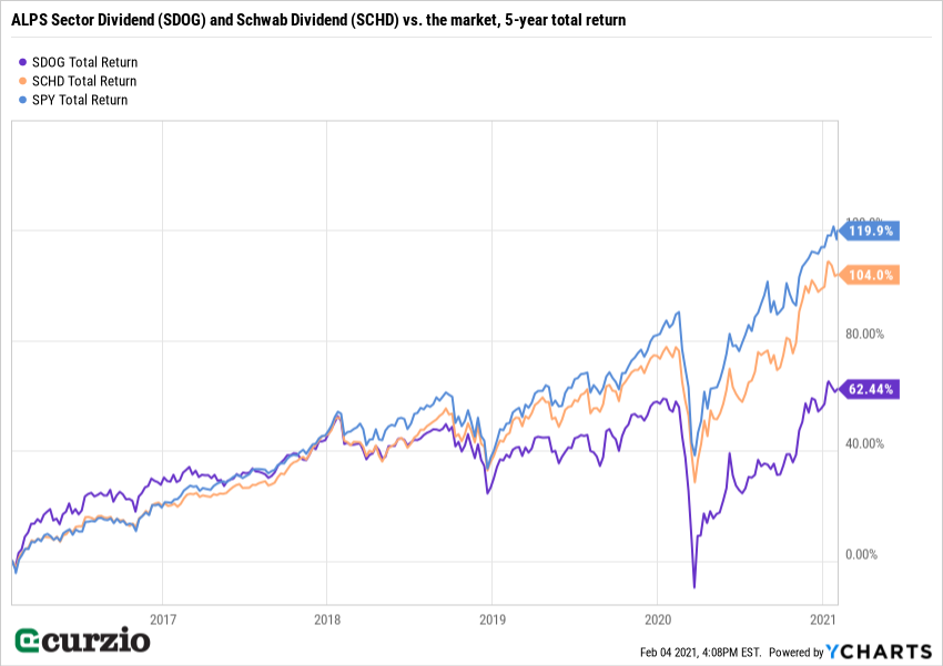 The chart below compares SDOG to the market… and to my other dividend favorite, Schwab U.S. Dividend Equity ETF (SCHD), a low-cost index fund with a focus on quality.