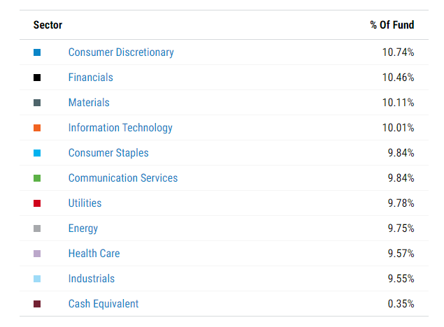 Today, for example, the largest sector in the ETF is consumer discretionary stocks… and the smallest is industrials. (This reflects recent strength in the fund’s consumer stocks vs. relative weakness among its industrial holdings.)