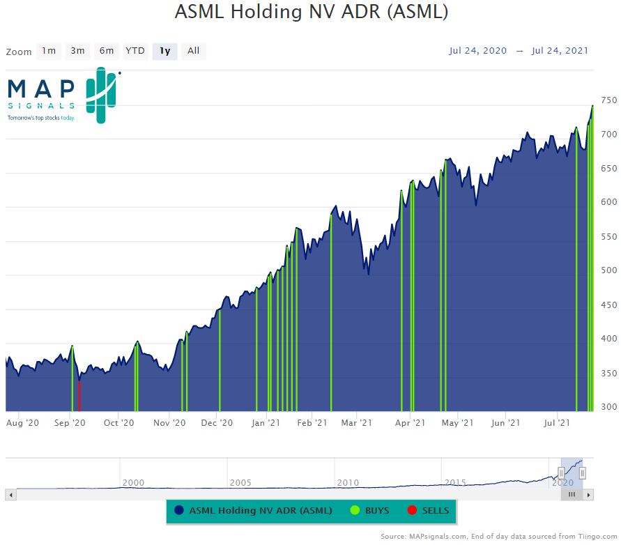 This positive guidance convinced Big Money players to buy the stock heavily. As you can see below, my data shows dozens of buy signals over the past year. Each of these green bars mean ASML saw outsized buying in a particular trading day.