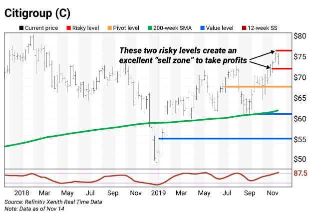 In August, we added to our Citigroup position in a “buy zone”… Today, we’re taking money off the table in a “sell zone.”