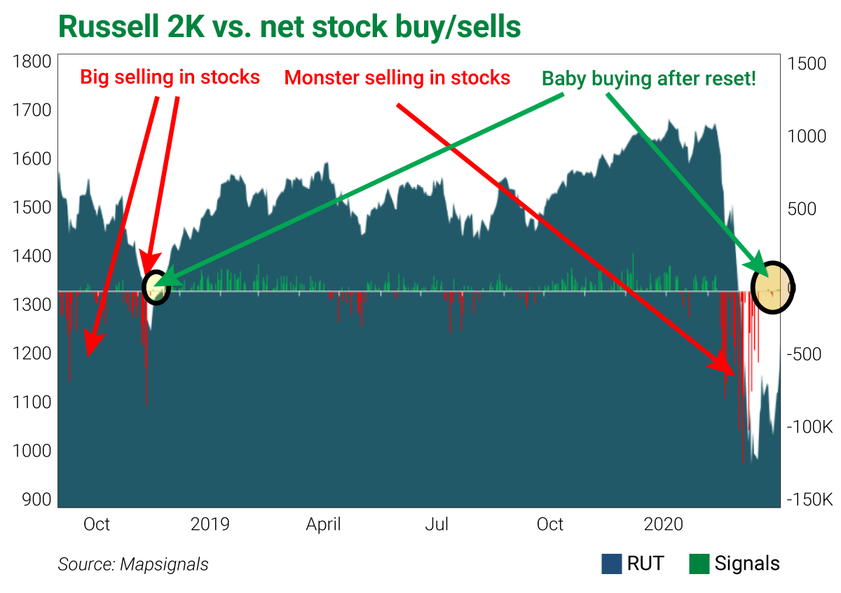 As you can see on the far left, the last time we had massive selling (December 2018), tiny green bars showed up right as the market took off like a rocket.