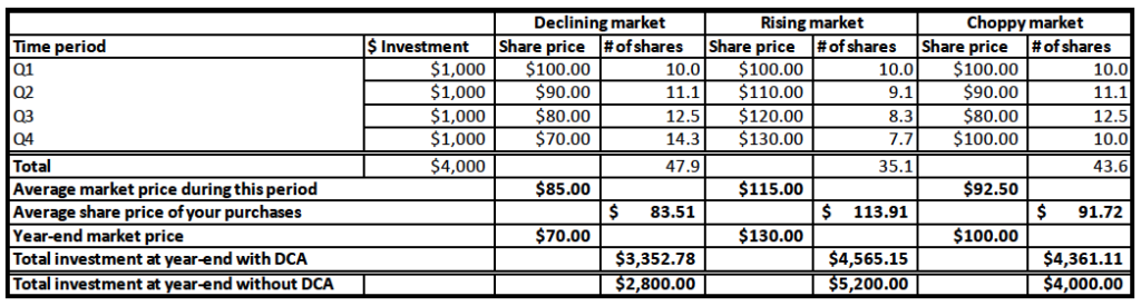 In a rising market, you’d end up with fewer shares… but your per-share cost will be lower than the average market price during this time.
