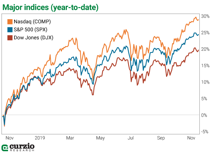 As of last Friday, the S&P 500 was up 24.1%, the Dow up 19.5%, and the Nasdaq up 28.4% for 2019.
