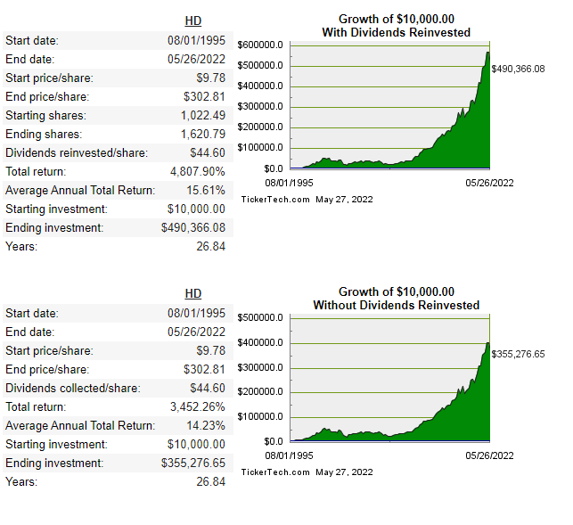 Up first is Home Depot (HD). The stock has been surging from the home improvement boom that erupted during the pandemic. But HD also has a history of consistently raising its dividend. Owning HD and reinvesting the dividends over the years has paid off: Since 1995, reinvesting dividends in the Home Depot beat out non-reinvestment by 1,355%!