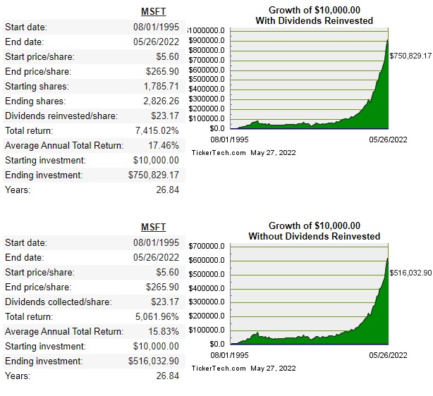 Check out the difference in reinvesting MSFT dividends versus not—it’s not even close:
