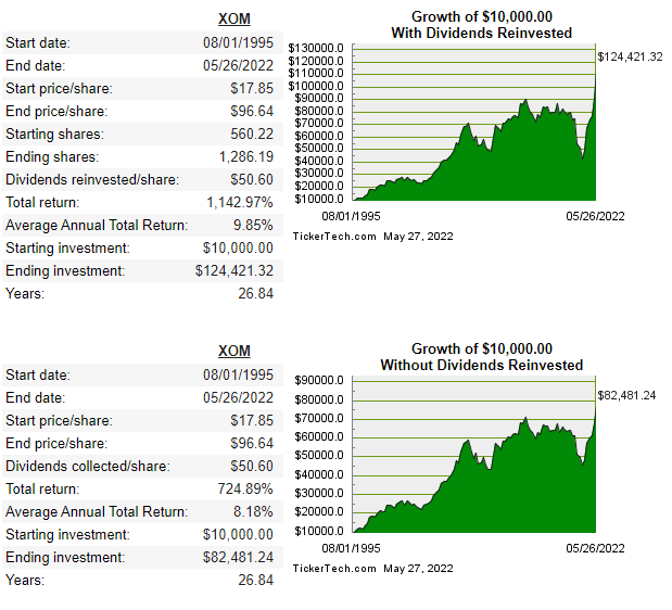 And as a final nod to my energy bulls, let’s look at Exxon Mobil Corp. (XOM). Energy stocks generally pay larger dividends, which could add even more juice to a dividend reinvestment strategy. It did for XOM: