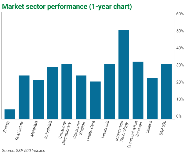And, as you can see from the chart below, every single market sector has been positive over the past 12 months. This trend was led by the technology sector, which returned an unbelievable 49.4%.