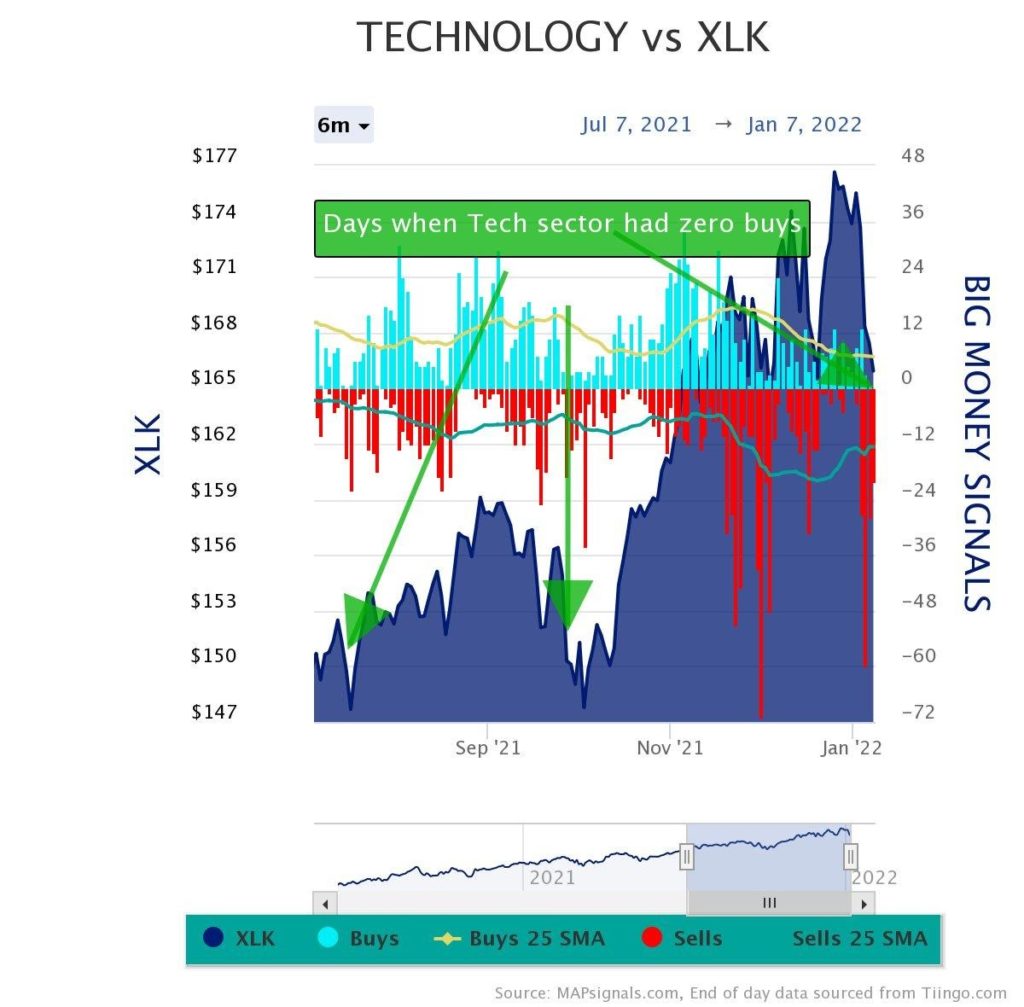 Below, I’ve included a six-month chart of the daily Big Money buys and sells across the tech sector. I drew an arrow pointing to Friday’s data of zero buys (at the far right). I also drew two arrows highlighting the last two times there was zero buying in tech stocks (July 16 and September 28, 2021).