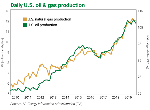 In the last decade, U.S. natural gas production—as measured in cubic feet (CF) instead of barrels—has soared 56%. And oil production has skyrocketed by 118%.
