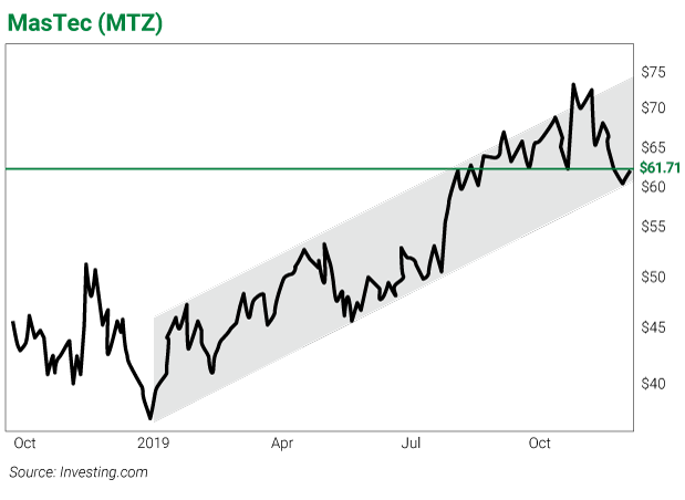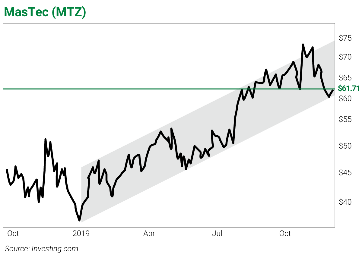 The company’s profits have grown at about 12% per year since 2014, and analysts expect that pace to continue for the foreseeable future. The stock is now trading at a forward price-to-earnings (P/E) ratio of about 11.0—less than the expected growth rate. That makes MasTec a bargain. Take a look…