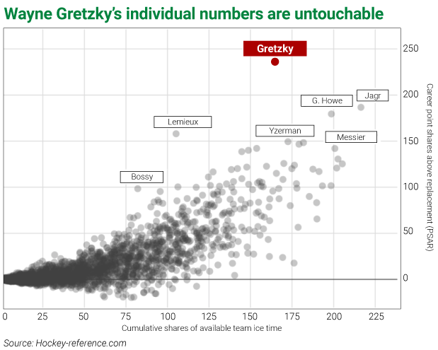 An easy example is sports. Michael Jordan, Tom Brady, and Wayne Gretzky are literally off the chart compared to other players. Just look at Wayne Gretzky’s points scored vs. time played, compared to all other NHL forwards over a 60-year period.