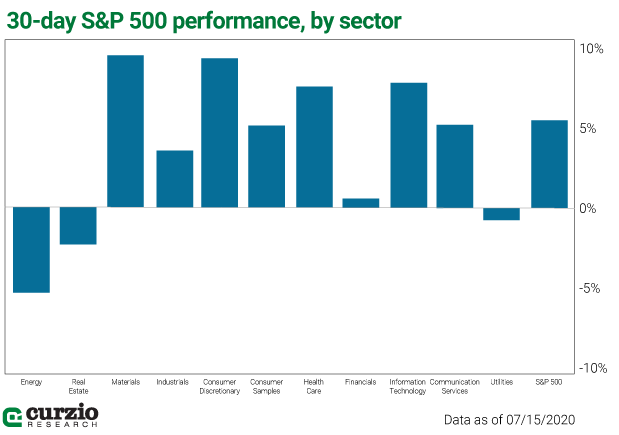 But in the past 30 days, financials have improved somewhat. It’s no longer the second-worst sector in the market. While still lagging the market itself (not to mention the technology, discretionary, and material sectors), financials are in positive territory—up 0.5% over the past month.