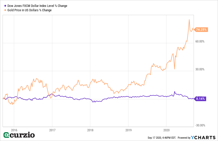 The chart below shows the price of gold vs. the Dow Jones FXCM Dollar Index, which tracks the value of the U.S. dollar relative to a basket of four currencies: the euro, the British pound, the Japanese yen, and the Australian dollar.