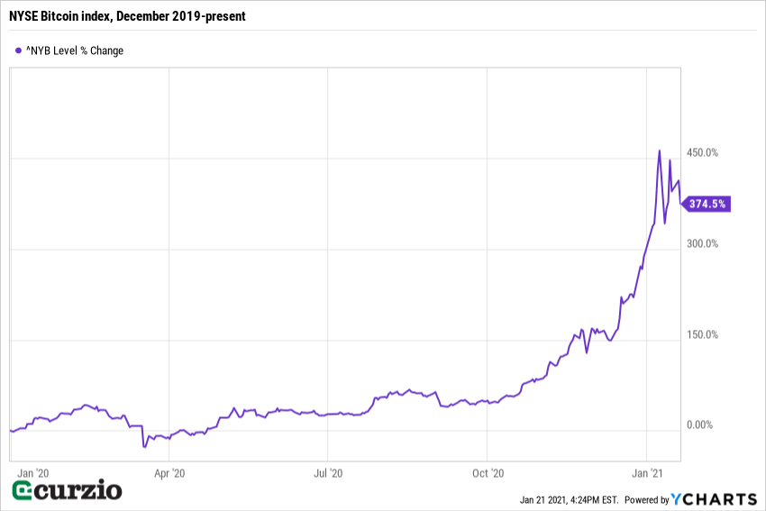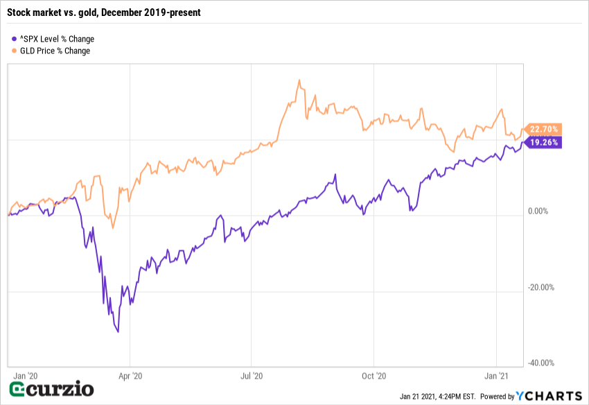 Gold outperformed the market over the past year… but it was outshone by bitcoin, another hedge-like instrument, which added some 400% to its price since the start of 2020.